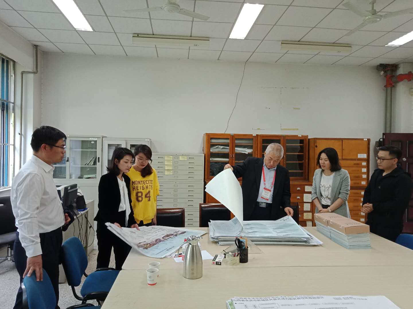 李和章教授来到学院建筑系本科资料管理室,对2017届本科毕业设计图纸、论文及毕设管理手册认真翻阅并检查,详细询问建筑学专业本科毕设的题目类型、题目来源、答辩环节及学生完成情况,对毕设题目构成、联合毕设、图纸成果及资料归档等方面给予肯定。