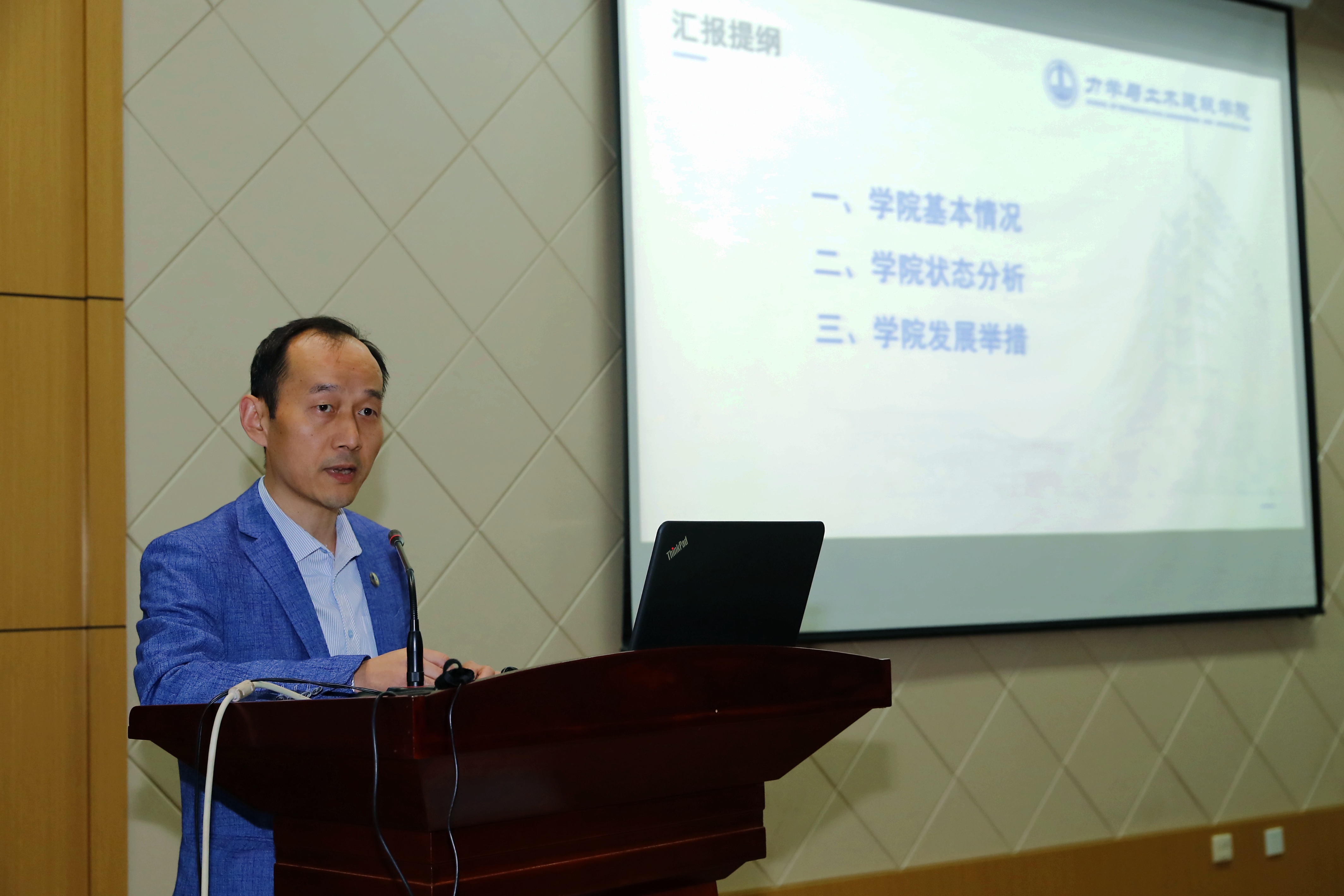 动员会上,李栋院长向全院教职工阐释了此次本科教学审核评估的原则、目的、重点、方法和主要内容,并分别介绍了学校和学院的本科教学工作情况,以及学院自评估整改落实情况。他指出,本科教学工作的水平评估是“用一把尺子量所有的高校”,而本科教学工作审核评估是以成果导向为引导, “用自己的尺子量自己”,更加注重学校的特色发展和内涵建设。高大力要求全院教职工在教育教学、人才培养以及审核评估等工作中,统一思想,提高认识,团结协作,以饱满的工作状态和自信的精神风貌,迎接学校专家组的审核评估检查。