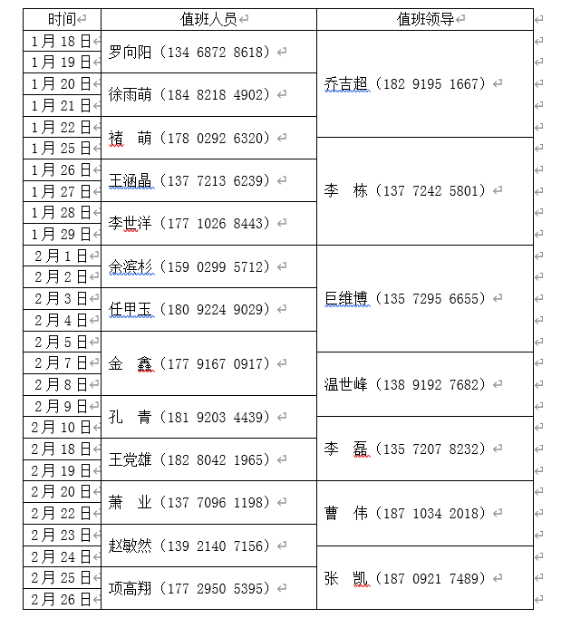 其中2月11日至2月17日为国家法定节假日,不安排值班;2月7日(星期日)、2月20日(星期六)正常安排值班。